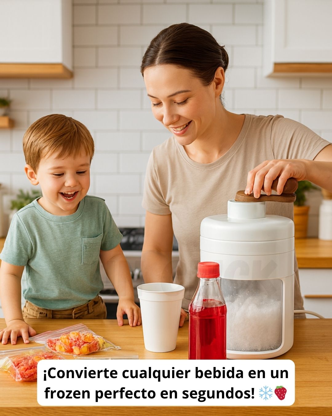 Uso sencillo: colocar hielo → girar manivela → retirar hielo triturado.